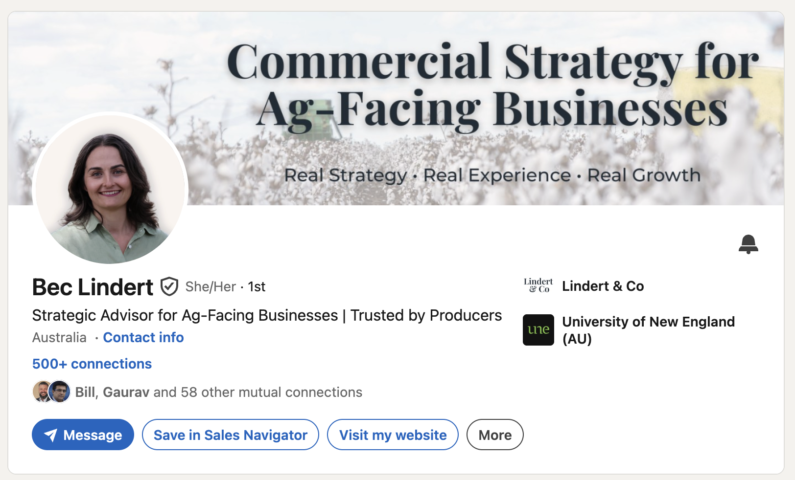 Her profile banner is a photograph of a cotton farm. Wide open landscape, the kind of sky that only exists out past the ranges. And underneath the photo, text that says what she does -- rural and regional businesses. That's it. No hard-sell call to action. No "book a free strategy session." Just the landscape and her positioning.
