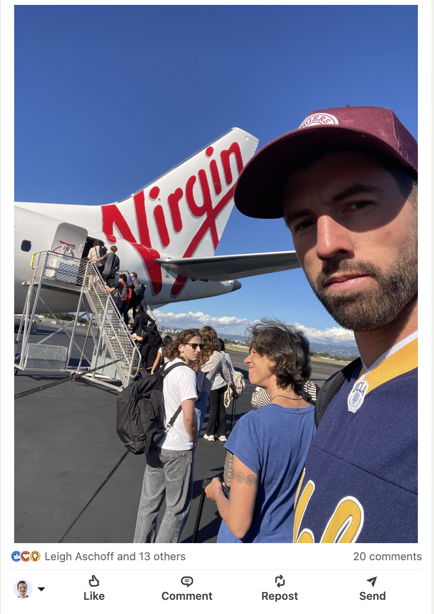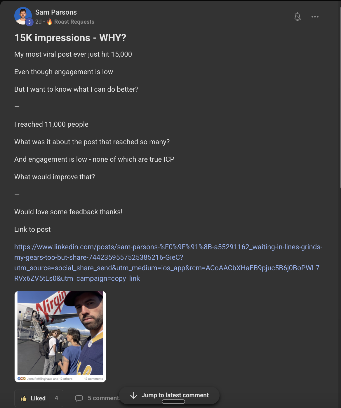 Now here's what matters about Sam's post. The recognition was real, but it didn't convert. He wasn't getting inbound DMs from it. Nobody was booking calls off the back of a tarmac photo. No leads. No clients. And that's fine. That's not what the post was doing.
