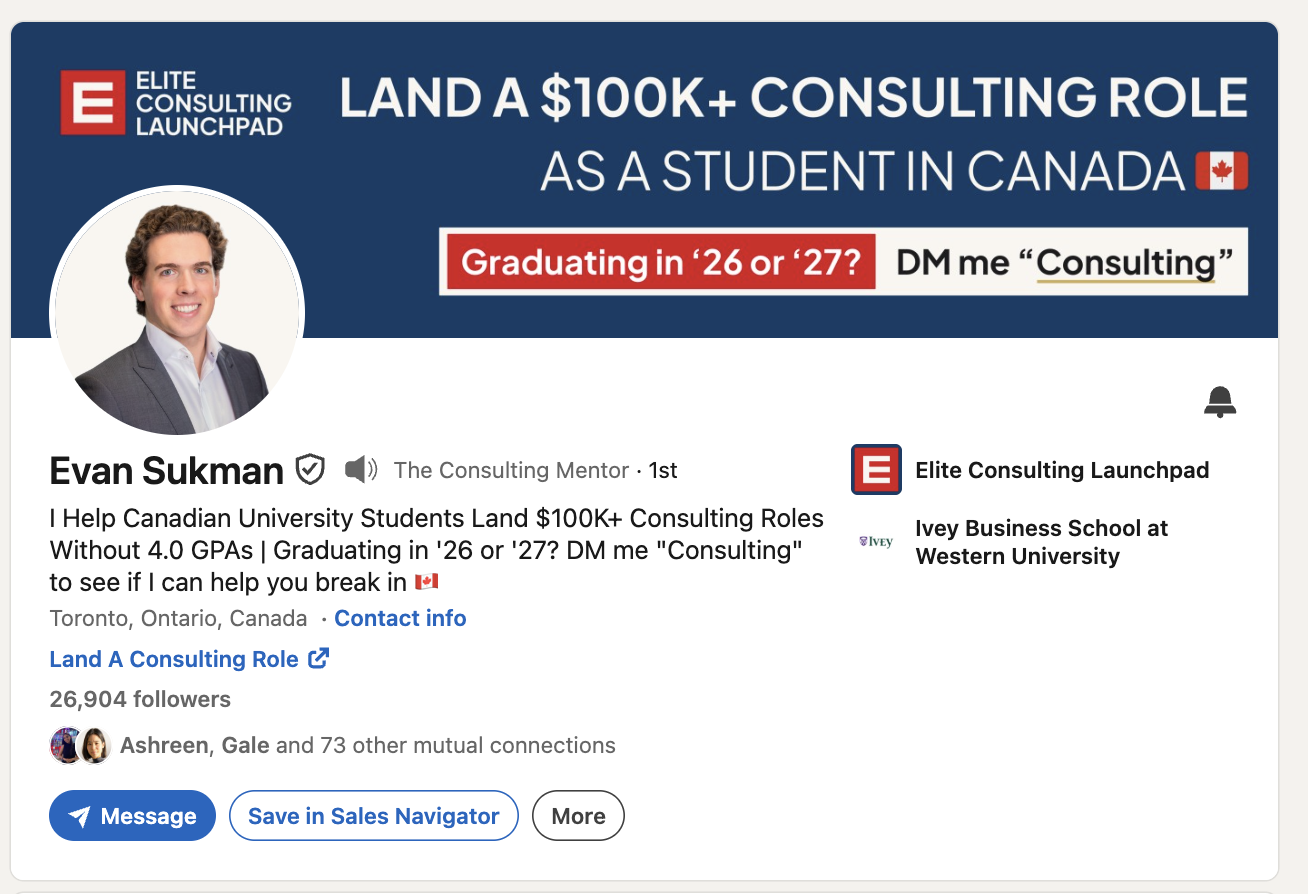 Not "students." Not "people interested in consulting." Students. In Canada. Consulting. Graduating this year or next. Targeting a specific first-role salary. And specifically the ones who don't have a perfect transcript, right? The ones who need a different path in.